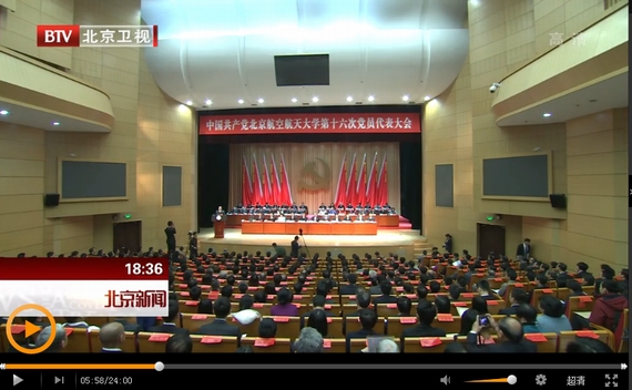 【镜头】北京航空航天大学第十六次党员代表大会会场镜头、北航党委书记张军院士在第十六次党员代表大会上做报告镜头、北航学生升旗镜头。