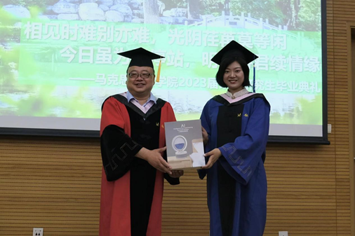 院长赵义良教授发表毕业寄语并代表学院向毕业生代表巩晗同学赠送纪念品。赵院长立足于新时代的历史方位,结合近些年我院的蓬勃发展,对毕业生提出了三点期望:一是要坚持学习,在今后的生活中广泛阅读,扩充理论知识储备,提高自身素养与能力;二是要学会做事,脚踏实地,谦虚谨慎,在新的工作岗位上创造新业绩;三是要学会做人,在未来的工作中积极运用自己的专业知识,认真工作,谦和待人,锻炼自己为人处世的能力。赵院长祝福毕业生们都能做到理论与实践二者的结合,体会到“别样的风景”,进一步提升自己的人生境界。