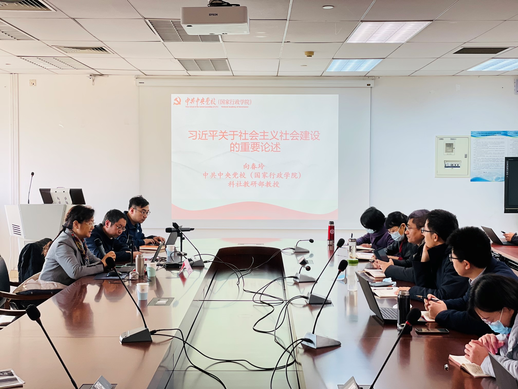 12月11日上午,云顶官网线路检测第十五次集体学习日活动在新主楼B座707室举行。中央党校向春玲教授应邀作了《习近平关于社会主义社会建设的重要论述》专题报告,活动由学院书记高宁主持,云顶官网线路检测师生30余人出席。